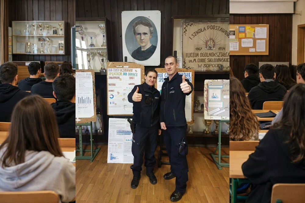 Funkcjonariusze spotkali się z uczniami I Liceum Ogólnokształcącego w Sopocie by poruszyć tematy istotne dla młodych ludzi w codziennym życiu. Profilaktyk młodszy aspirant Szymon Rożek oraz dzielnicowa sierżant Weronika Budnik omówili zagrożenia związane z kontaktem z substancjami zabronionymi i używkami oraz zwrócili uwagę na konsekwencje prawne i zdrowotne sięgania po takie środki.