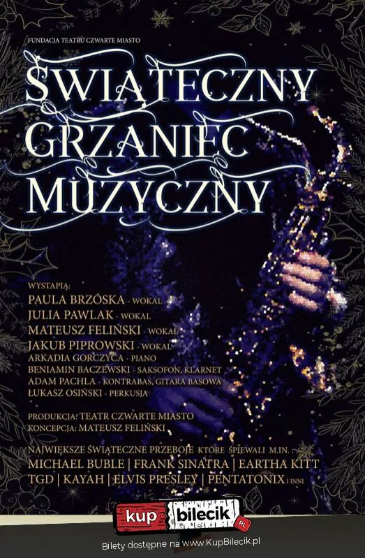 bilety: to wyjątkowa propozycja dla każdego kto uwielbia święta Bożego Narodzenia. Klimatyczne światełka, trzaskające drewno w kominku, puszysty śnieg za oknem, zapach pieczonego ciasta… Każdemu z nas przychodzi do głowy coś innego gdy myślimy o Świętach, lecz w jednym jesteśmy zgodni - nie ma Świąt bez muzyki! Nic tak nie rozpala naszych serc zimą jak świąteczne przeboje - od jazzowych standardów Franka Sinatry czy Michaela Buble po nasze rodzime podwórko i kolędy znane z wykonań Kayah, Kuby Badacha czy TGD. Zapraszamy na wyjątkowy koncert w trakcie którego wybrzmią Wasze ulubione bożonarodzeniowe piosenki! Nasi artyści harmonią swoich głosów, ciepłym brzmieniem saksofonu i muzyką na żywo sprawią, że będzie to niezapomniany wieczór! Świąteczny Grzaniec Muzyczny artyści: Teatr Czwarte miastoto wyjątkowa propozycja dla każdego kto uwielbia święta Bożego Narodzenia. Klimatyczne światełka, trzaskające drewno w kominku, puszysty śnieg za oknem, zapach pieczonego ciasta… Każdemu z nas przychodzi do głowy coś innego gdy myślimy o Świętach, lecz w jednym jesteśmy zgodni – nie ma Świąt bez muzyki! Nic tak nie rozpala naszych serc zimą jak świąteczne przeboje – od jazzowych standardów Franka Sinatry czy Michaela Buble po nasze rodzime podwórko i kolędy znane z wykonań Kayah, Kuby Badacha czy TGD. Bilety do nabycia na: KupBilecik.pl |